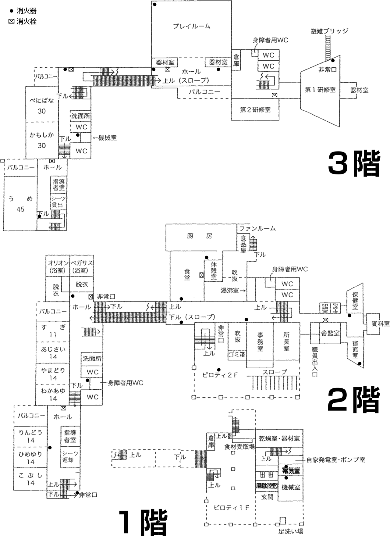 和室畳敷き10室(ふすまで仕切った場合:すぎ、あじさい、やまどり、わかあゆ、りんどう、ひめゆり、こぶし、べにばな、かもしか、うめ)、定員200名(小学生の場合)、指導者室2室(1部屋5名)